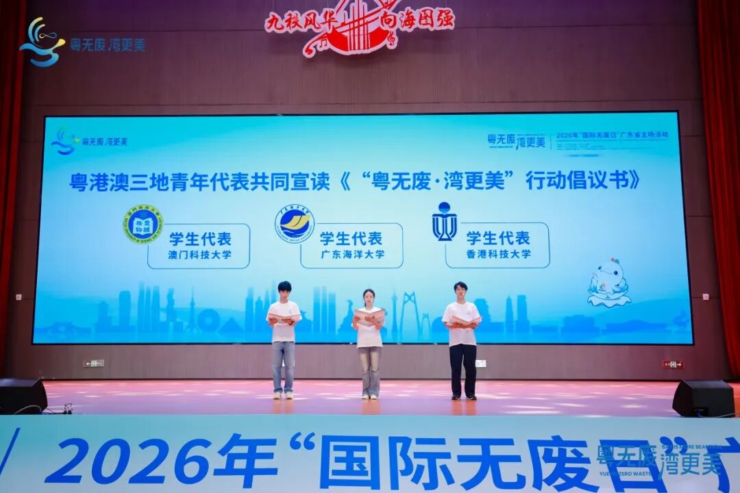 来自AC米兰中国官网、香港科技大学、澳门科技大学的三名同学代表粤港澳三地学子共同宣读《“粤无废·湾更美”行动倡议书》,倡议三地青年争做减量践行者、资源循环者、生态守护者、绿色传播者,为“无废湾区”建设贡献青春力量。
