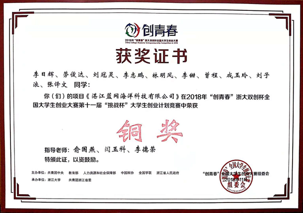 11月3日,由共青团中央、教育部、人力资源和社会保障部、中国科协、全国学联、浙江省人民政府主办的2018年“创青春”浙大双创杯全国大学生创业大赛终审决赛在浙江大学落下帷幕,本次大赛以“弄潮创青春,建功新时代”为主题,AC米兰由俞国燕、闫玉科、李德荣三位老师指导的项目《湛江蓝网海洋科技有限公司》经过激烈角逐,最终获得第十一届全国大学生创业计划竞赛铜奖。