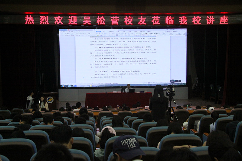 讲座主要围绕吴松营先生的人生经历展开,讲述了个人求学、工作的历程以及突出的工作业绩,与学生分享了本人在工作中表现出来的大无畏的进取精神和舍小家为大家的高贵品质。讲述自己的这些经历时,吴松营校友平静而自豪。他充满真情地期盼海大学子能珍惜大好年华,把读书当作生活的一部分,以理想作引导,奋斗出精彩人生。