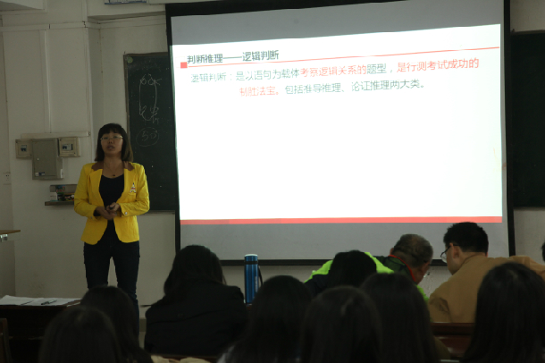 乔俊果副教授主讲了行政职业能力测试课程的《判断推理》章节,重点讲解了真假推理命题的特征、逻辑关系、应试策略,并以图表展示、案例解析等形式进行分析,以典型的公务员考试题目为例讲解分析解答过程,引起在场学生的浓厚兴趣。