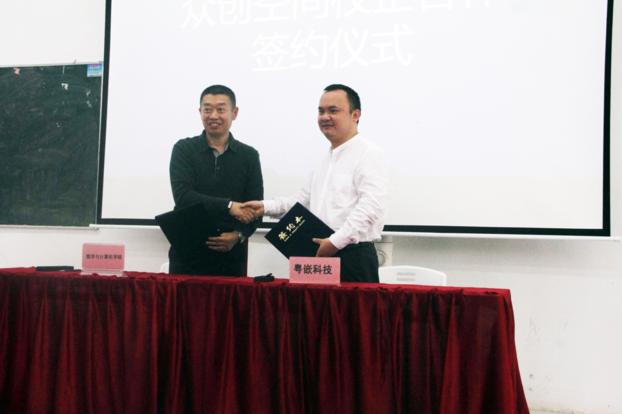 最后,数学与计算机学院和广州粤嵌科技公司进行了校企合作“众创空间”签约仪式和揭牌仪式,粤嵌公司现场捐赠了30多万的设备给数计学院,活动在热烈的掌声中圆满结束。