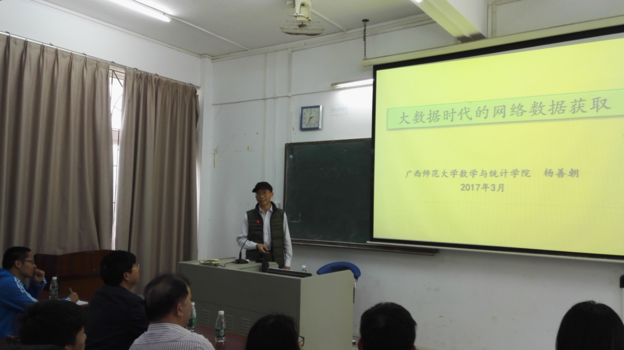 3月31日,应数学与计算机学院的邀请,广西师范大学数学与统计学院二级教授杨善朝老师在钟海楼03029教室为学院100多名师生讲授题为《大数据时代的网络数据获取》的学术报告,副院长吴卫祖主持了报告会。