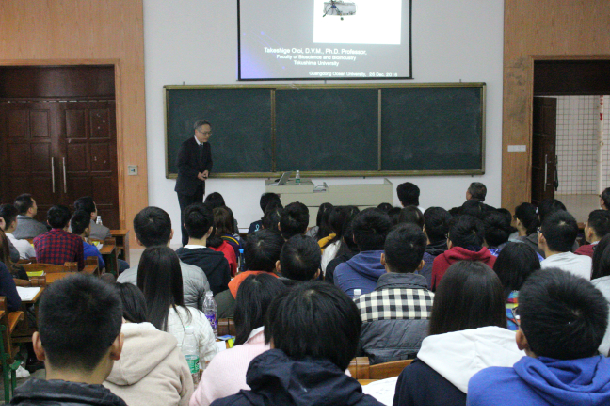 学术报告会上,音井威重教授首先讲述了日本动物辅助繁殖技术的发展历史及其在转基因动物研究领域取得的成果,并结合自身研究,对有关生殖技术发展的国际现状进行了深刻的分析。谷口雅康副教授讲述了日本山口大学的畜牧兽医专业教育情况及其本人在大动物胚胎采集和胚胎移植技术及性空冷冻精液方面的最新研究成果。动物医学系副主任巨向红教授对学术报告进行了穿插评述。报告会互动场面活跃,日本专家对师生提问一一给予精彩解答。