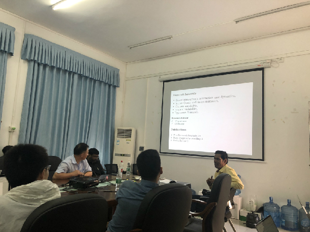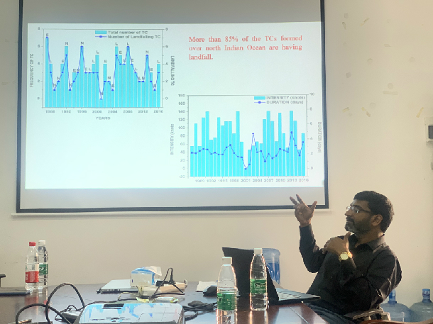 P.V.S. Raju教授的报告从热带气旋的观测资料、孟加拉湾热带气旋天气预报模式模拟、沙特阿拉伯吉达的强降雨事件三个方面展开。他指出,季候风前的热带气旋在印度北部和东北部登陆,而季候风后的热带气旋则会袭击印度海岸。他认为,随着初始条件(资料同化技术)和顶点初始化的改进,利用高级天气研究预报模式(WRF-ARW)对热带气旋的预测还有提高的空间。M.V. Subrahmanyam副教授在报告中首先指出,印度洋上空存在一种与其他赤道海域不同的独特的风场分布:季风季节性地在北印度洋上空逆转,夏季风的风力比冬季风强得多。之后,他从季风开始时海气通量和蒸发变化方面对其进行分析。他还强调了海气相互作用在台风的发生、移动、增强和登陆过程中的重要作用。会后,在场师生与P.V.S. Raju教授和M.V. Subrahmanyam副教授就台风模拟和预测、印度夏季风的爆发、以及整个分析过程应用到南海区域等问题进行了深入探讨,并对进一步的交流合作达成了共识,对研究工作具有启发和指导意义。