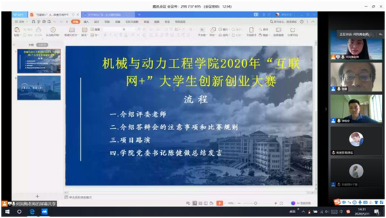 5月31日下午,机械与动力工程学院通过腾讯会议举办了2020年“互联网+”大学生创新创业大赛,学院党委书记陈健、副书记钟桂安、副院长徐青以及赖学江教授、韩卫国教授、胡远忠副教授、沙金博士等担任了此次比赛的评委,活动由院团委书记何凤梅主持。