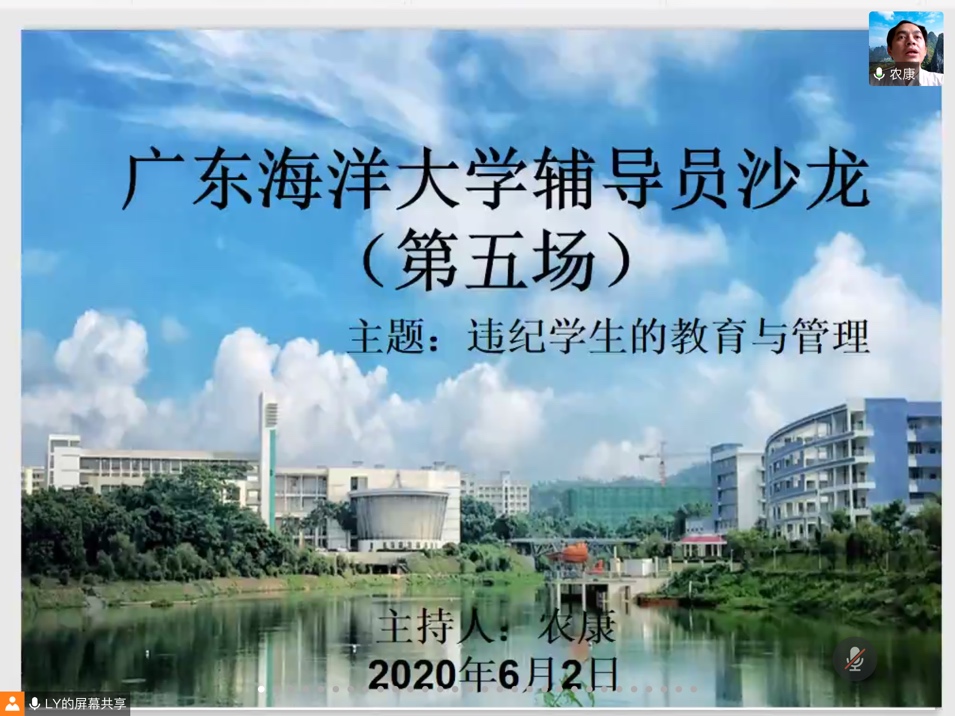 6月2日下午,由学生工作部(处)主办、中歌艺术学院承办的辅导员沙龙(第五场)如期在腾讯会议平台线上举行。本次沙龙活动以 “违纪学生的教育与管理”为主题,中歌艺术学院4名辅导员老师围绕学生个案剖析、违纪行为现象分析、学生管理工作中存在的问题以及管理经验等方面进行探讨分享。学生工作部副部长林忠新、部分学院党委副书记及全校近百名辅导员参加,中歌艺术学院党委副书记农康主持。