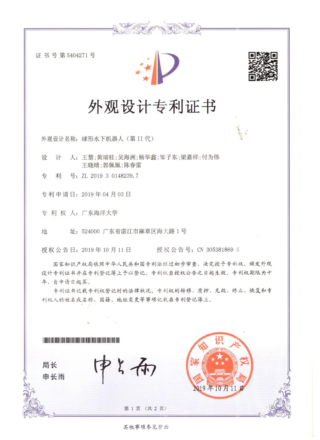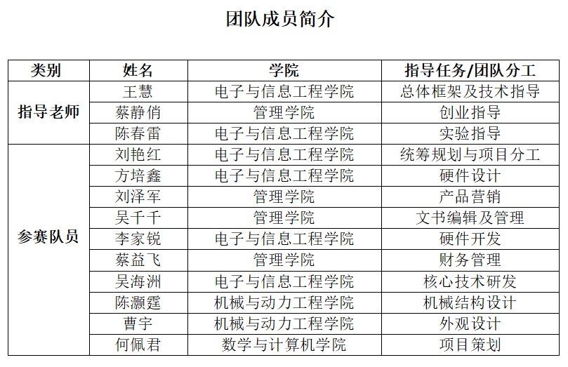 本次参赛团队成员由电子与信息工程学院水下机器人团队联合管理学院、机械与动力学院、数学与计算机学院等多个学院的不同专业师生组成。该团队发表项目相关论文2篇,已获2项外观专利授权,还有1项实用新型专利正在受理之中。