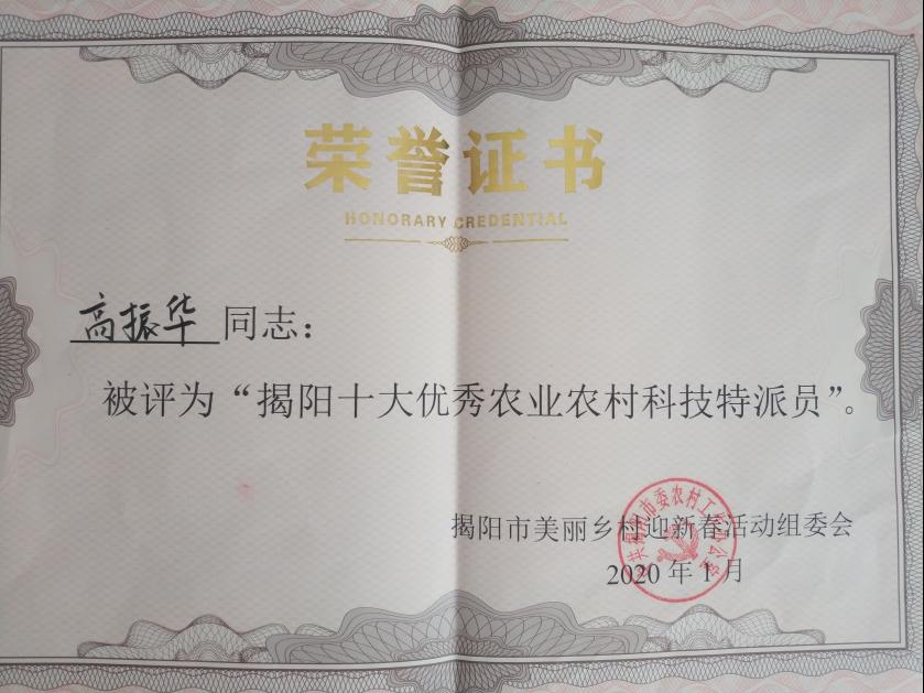高振华被评为“揭阳十大优秀农业农村科技特派员”