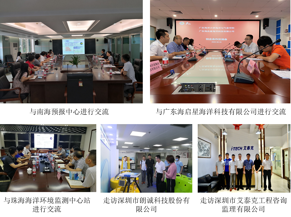 海洋与气象学院副院长陈法锦教授、孔德明副教授、陈清香老师和梁朋老师组成调研一组,先后考察了自然资源部北海海洋环境监测中心站、第四海洋研究所、海口海洋环境监测中心站和广东雷州珍稀海洋生物国家级自然保护区管理局。海洋与气象学院实验教学中心主任曹瑞雪老师、黄超老师、封宝鑫老师和梁敬伟老师组成调研二组,考察了自然资源部珠海海洋环境监测中心站、深圳市朗诚科技股份有限公司、深圳市艾泰克工程咨询监理有限公司,广东海启星海洋科技有限公司和南海预报中心。海洋与气象学院院长谢玲玲教授带队参加了自然资源部第四海洋研究所和南海预报中心的调研。