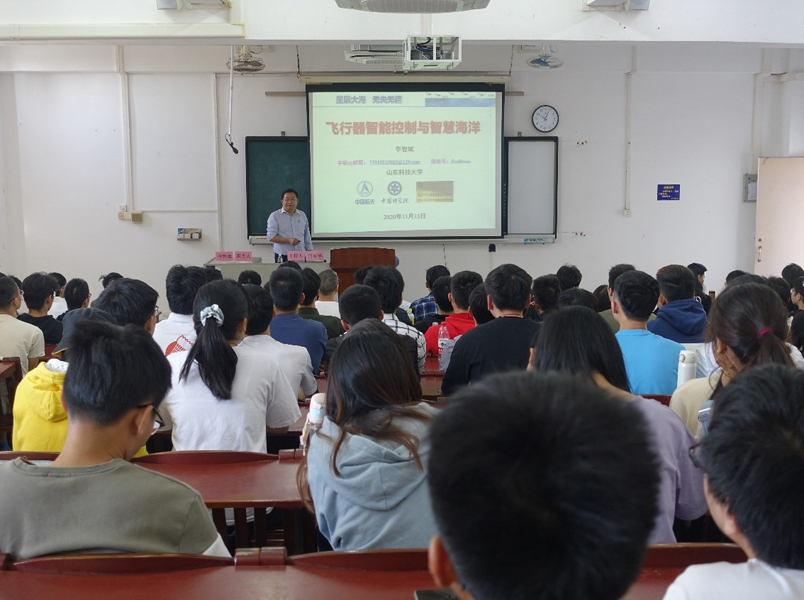 11月13日上午,山东科技大学李智斌教授应邀到电子与信息工程学院进行学术交流,在湖光校区钟海楼06022为学院师生作了题为“飞行器智能控制与智慧海洋”的学术报告。报告会由院长付东洋教授主持,学院领导、相关专业教师及学生一百多人参加本次报告会。