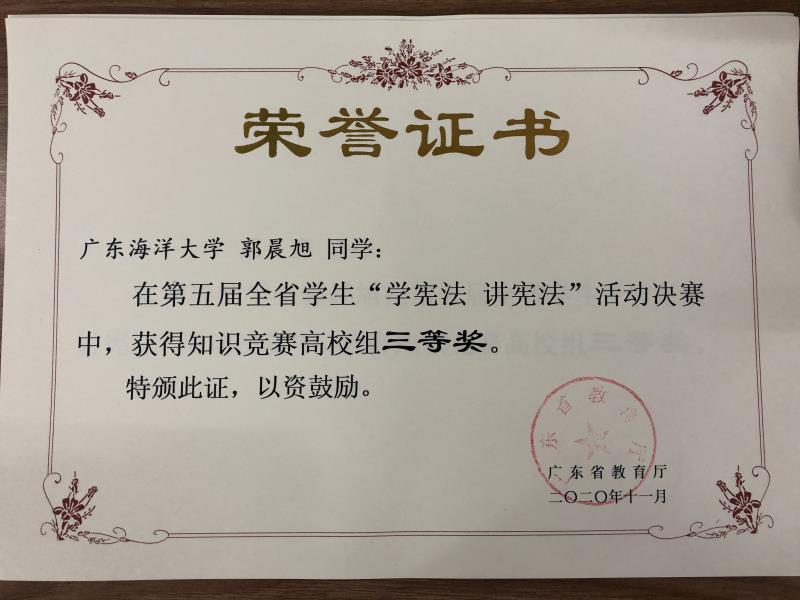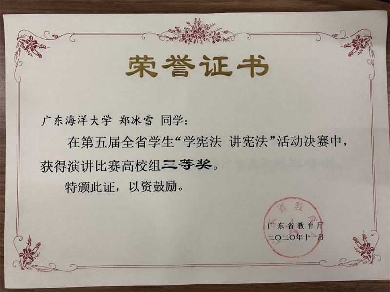 近日,AC米兰法政学院法学专业18级1186班郑冰雪同学、19级1191班郭晨旭同学在今年省教育厅举办的全省学生“学宪法讲宪法”活动决赛中,分别获得演讲比赛高校组三等奖、知识竞赛高校组三等奖。