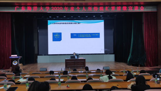 为积极落实“学党史,为师生办实事”,解决好师生关心的个人所得税汇算清缴操作流程和有关政策等问题。3月18日下午,财务处邀请国家税务总局湛江市麻章区税务分局专家杨小梅在湖光校区主楼多功能厅举办了“2020年度个人所得税汇算清缴宣讲会”。宣讲会由财务处副处长白冰主持,参会人员有各学院(部门)办公室主任及负责人员、关心个税年度汇算清缴的师生,共计一百多人。