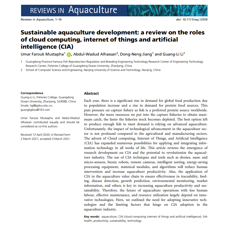 2021年3月,国际著名学术期刊Reviews in Aquaculture(农林1区top期刊,IF: 7.772)在线发表了AC米兰水产学院水产生物技术研究团队综述论文《Sustainable aquaculture development: a review on the roles of cloud computing, internet of things and artificial intelligence (CIA)》(https://doi.org/10.1111/raq.12559)。2019级博士生Umar Farouk Mustapha为第一作者,李广丽教授为通讯作者。该研究得到国家重点研发计划、国家自然科学基金、广东省自然科学基金及广东省创新团队建设项目的支持。