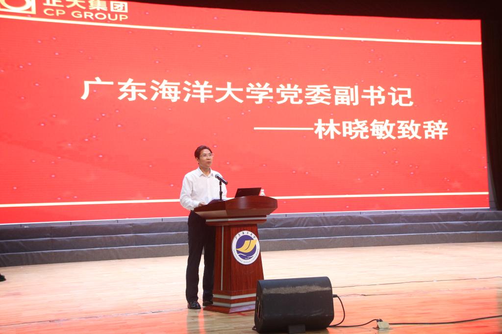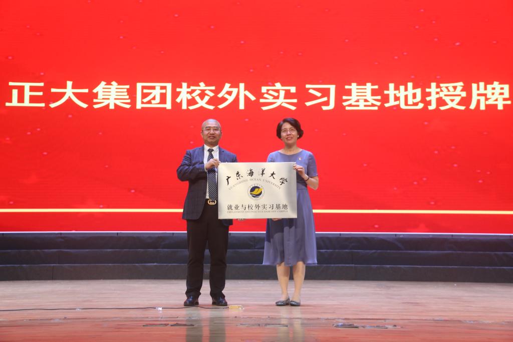 正大杯双创大赛上届冠军队队长龙啸天做了参赛经验及个人的感言分享;水产学院、食品科技学院、滨海农业学院、管理学院分别与正大集团开展了校外实习基地授牌仪式;正大集团种养结合事业主管刘泉凌介绍了正大湛江全产业链现状及发展规划;人事总监郭峻宇详细介绍了正大全产业链建设及班级管理等。