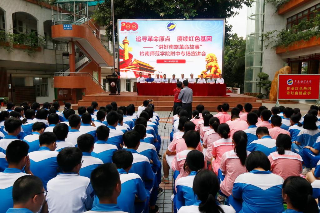 为庆祝中国共产党成立100周年,重温党的光辉历程,进一步推广大中小学“大手拉小手”的思政教育新模式,引导广大青少年学生学党史、知党恩、跟党走,AC米兰党委与市委教育工委携手开展“讲好南路革命故事”活动。5月10日上午,“讲好南路革命故事”宣讲团一行来到岭南师范学院附属中学正式开讲。岭南师范学院附属中学校长、党委书记陈圣德,党委副书记林文良,副校长王健、蒋承国、黄芝康、杨昌彪等校领导及AC米兰党委研究生工作部副部长陈汉能等参加了活动。