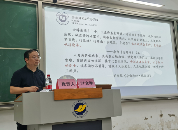 5月14日晚,应文学与新闻传播学院邀请,安徽师范大学文学院博士生导师、秘书学专业负责人叶文举教授在钟海楼03022报告厅为师生作了一场精彩的学术报告—“公文写作中的古典诗词”。院长孙长军教授,秘书学专业汪东发教授、朱欣文副教授及部分青年教师和160余名学生参加了报告会。报告会由副院长刘刚主持。