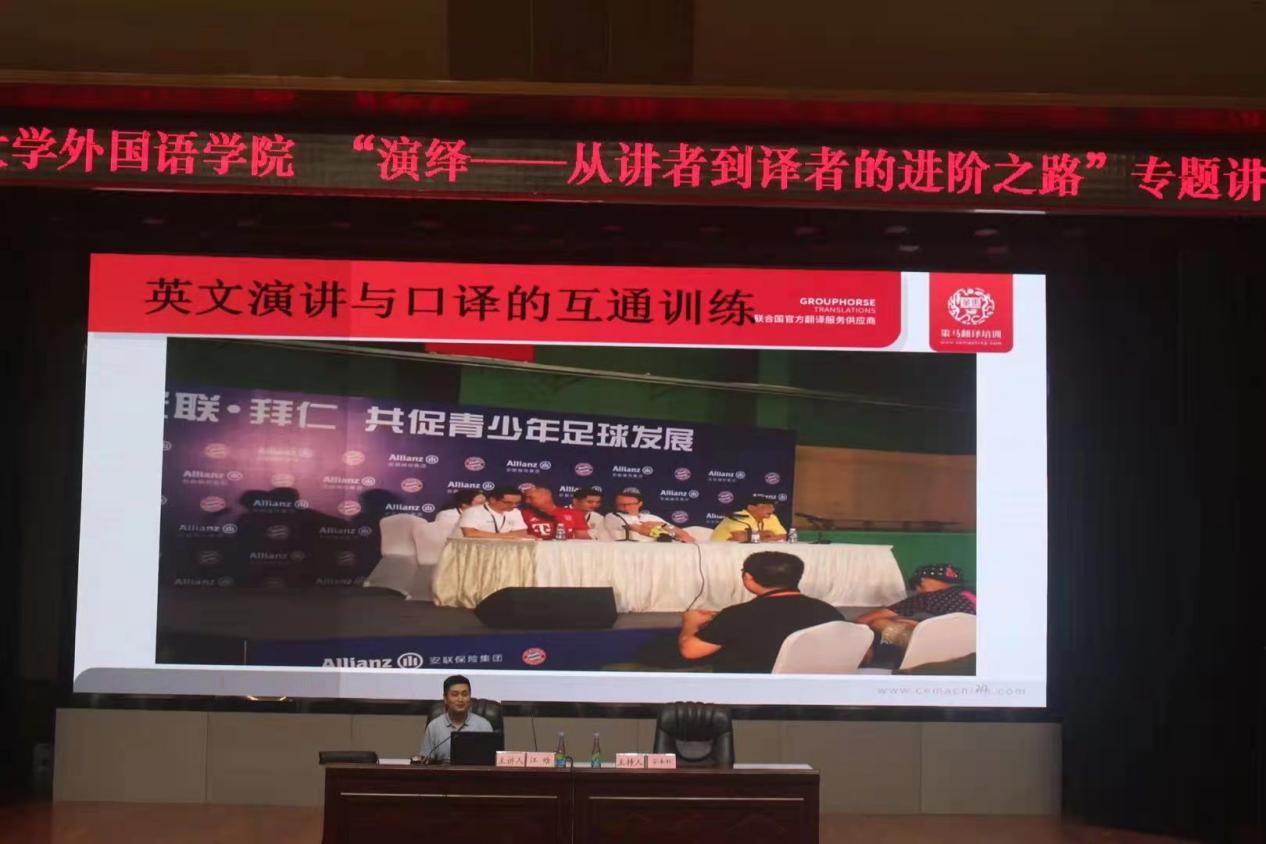 5月24日晚上7:00,在湖光校区主楼多功能厅,来自策马翻译有限公司翻译独家译训师、翻译总监江晗副教授,做了题为《演绎--从讲者到译者的进阶之路》为主题的专题讲座,学院副院长安丰科博士主持,外国语学院二年级学生和英语专业三年级学生共计约500人参加本次讲座。