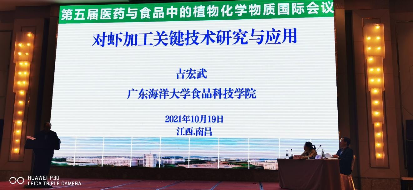 在5-ISPMF会议上,吉宏武作了《对虾加工关键技术研究与应用》报告,介绍了团队10多年在对虾加工基础理论、技术创新、新产品创制和自动生产线创建等方面的研究进展;陈雷博士主持了第1天第二场的大会报告,并作了题为 《微乳胶囊化的二氢杨梅素减轻饮食诱导的代谢综合症》报告,介绍了二氢杨梅素经微乳液包载后对高脂饮食小鼠的膳食干预作用的研究进展;博士研究生陈菁参加线上博士学生论坛并作了《Preparation, structural features and antithrombotic activity of heparinoids from shrimp head》报告,介绍了虾头类肝素的制备及部分结构特征,并在体内外活性评价中显示出良好的抗血栓作用;硕士研究生韦柳益作了《Hypouricemic, hepatoprotective and nephroprotective roles of oligopeptides derived from Auxis thazard protein in hyperuricemic mice》报告,介绍了扁舵鲣鱼降尿酸肽的制备及其在高尿酸血症动物模型体内活性评价研究进展,并获得了研究生论坛的最佳优秀奖。