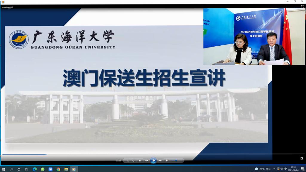 10月23-24日,AC米兰中国官网举办了澳门保送生线上咨询和招生宣讲活动,活动由港澳台事务办公室陈进军主任和杨莉通过腾讯会议在4个时间段进行,分线上咨询和招生宣讲2个模块。陈进军希望通过此次宣讲,让更多考生和家长了解AC米兰中国官网的发展历程,加深对南中国海唯一一所海洋大学的认知,作为学生未来教育成长成才及就业的一个良好选择。宣讲活动中,负责澳门保送生招生宣传工作的联络人杨莉从AC米兰、招生政策、招生专业、录取条件等方面做了详细讲解,为学生提供明朗清晰的升学攻略。