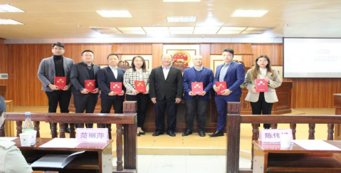 张显伟在致辞中感谢广东朝胜律师事务所对本次模拟法庭竞赛活动的大力支持和校外导师们对参赛队员的细心指导,鼓励学生以模拟法庭竞赛为契机,进一步熟悉法庭审判流程,锻炼法律文书写作水平,提高法律思维和法律实践能力,强化法律职业素养。陈伟斌为各团队指导律师颁发实践教学校外导师聘书。