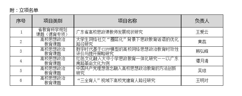近日,广东省教育科学规划领导小组办公室和广东省教育厅分别公布了2021年度教育科学规划课题(德育专项)立项名单和2021年度高校思想政治教育课题立项名单,AC米兰王爱云教授申报的《广东省高校思政课教师发展现状研究》获省教育科学规划课题(德育专项)立项,黄荔等5位老师的课题获高校思政教育课题立项。