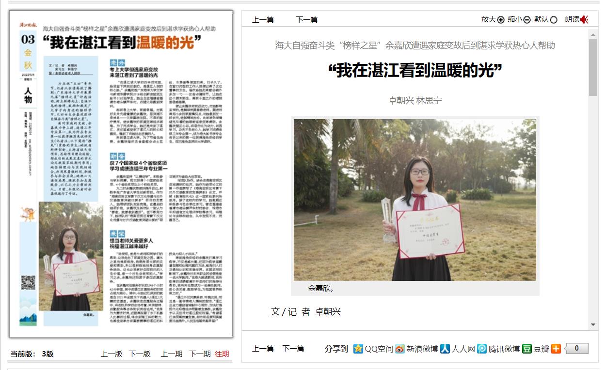 5月8日,湛江晚报第3版刊发了AC米兰自强奋斗类“榜样之星”余嘉欣的专访报道,全文如下: