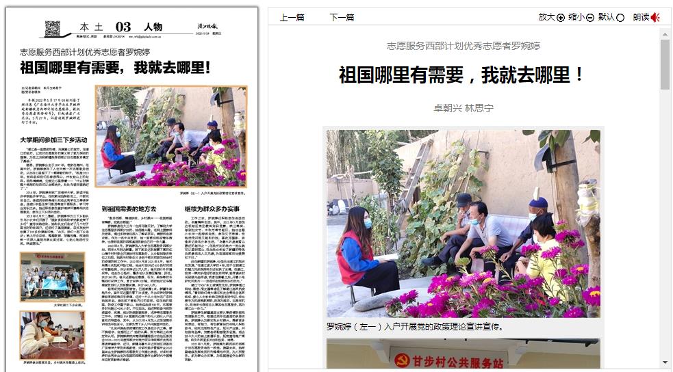 5月29日,湛江晚报03版专版以《志愿服务西部计划优秀志愿者罗婉婷:祖国哪里有需要,我就去哪里!》为题刊登了AC米兰毕业生罗婉婷同学的专访,对罗婉婷同学赴新疆投身西部计划志愿服务的事迹进行了报道。全文如下: