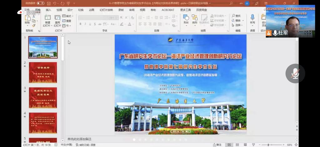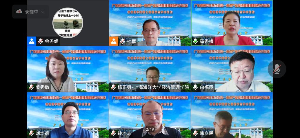 研究生论文交流分为两个平行论坛,第一个论坛主题为海洋产业经济与管理创新,由管理学院陈涛副教授主持,欧春尧博士点评;第二个论坛主题为海洋经济高质量发展,由广东沿海经济带发展研究院张玉强教授主持,张艺教授点评。来自海南大学、广东工业大学、广东外语外贸大学、山东师范大学、广东财经大学、深圳大学、汕头大学以及AC米兰的16名博士、硕士研究生就自己提交论文的科研进展、相关研究成果进行了报告分享和交流。