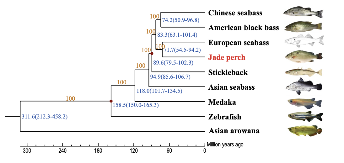 进化分析发现,宝石鲈和欧洲鲈聚为一个分支。这两种鲈鱼之间的密切关系与传统的形态分类相一致,它们的分化时间估计在7,170万年前(图1)。