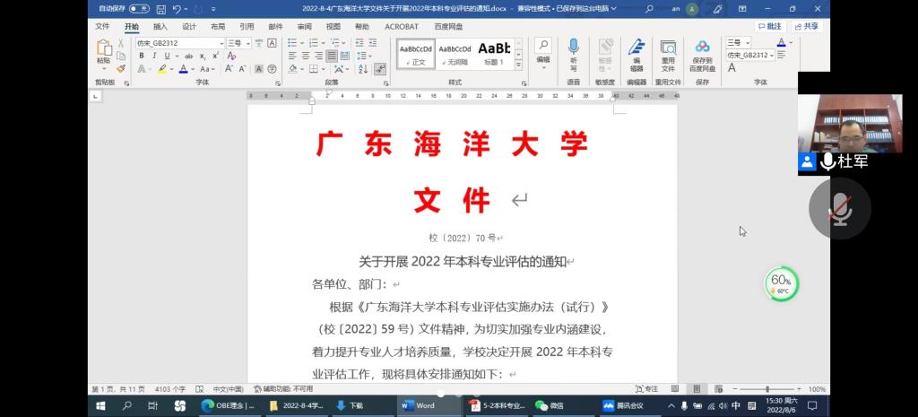 为认真贯彻学校工作部署,扎实开展好本科专业评估工作,8月6日下午,管理学院召开2022年本科专业评估工作部署动员会,会议通过腾讯会议进行。学院党政领导、各系主任、专业负责人、办公室主任、教务员等一起参加了会议。