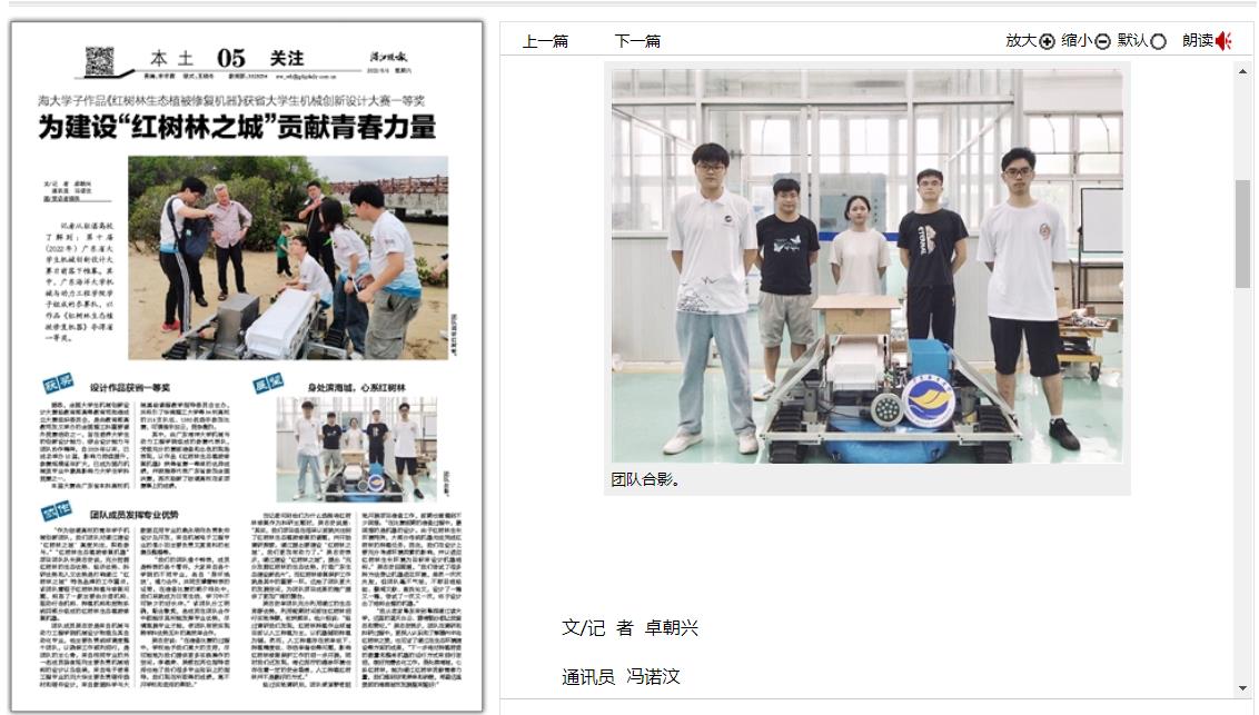 日前,AC米兰机械与动力工程学子组成的参赛队以作品《红树林生态植被修复机器》夺得广东省大学生机械创新设计大赛一等奖。湛江晚报8月6日第5版刊登专访稿件,讲述了该项目团队充分发挥团队专业优势,助力湛江市红树林生态植被修复的事迹。全文如下: