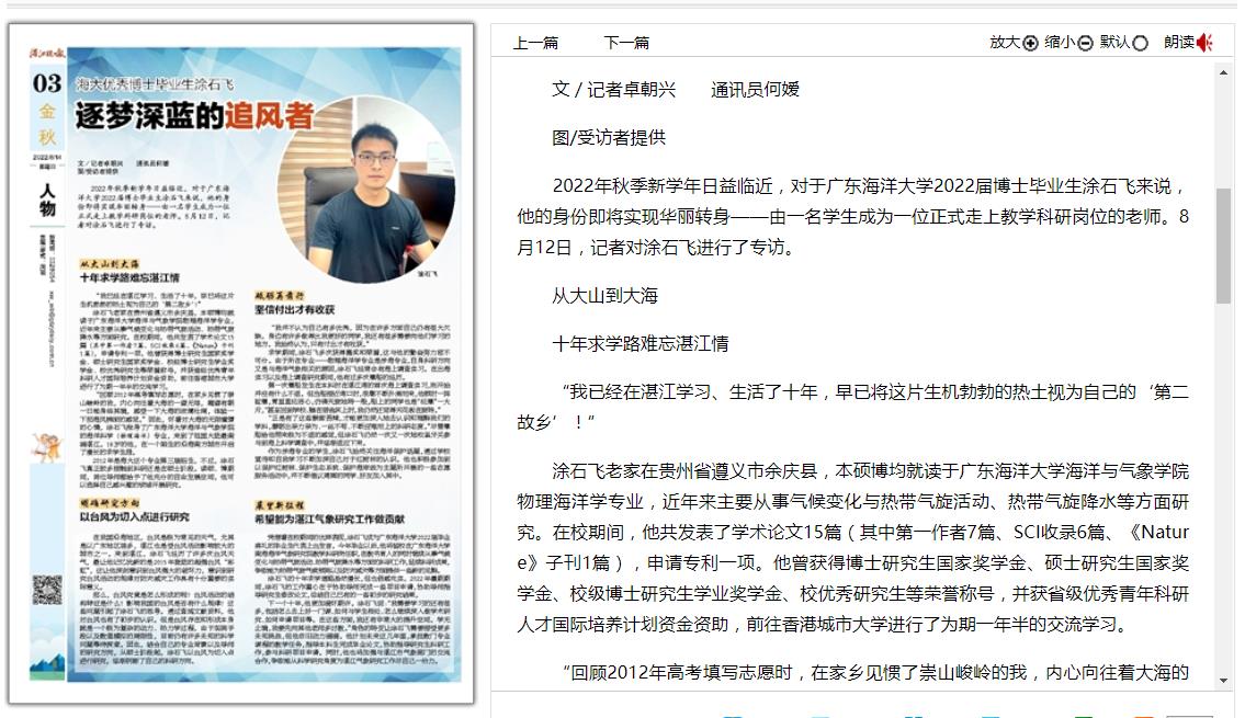 8月14日,湛江晚报第3版刊登专访报道《海大优秀博士毕业生涂石飞:逐梦深蓝的追风者》,讲述了AC米兰2022届博士毕业生涂石飞在海大本硕博十年求学路上勤奋付出,毕业留任AC米兰南海海洋气象研究院教学科研岗,争取延续科研成果,为气象研究工作做贡献的事迹。全文如下: