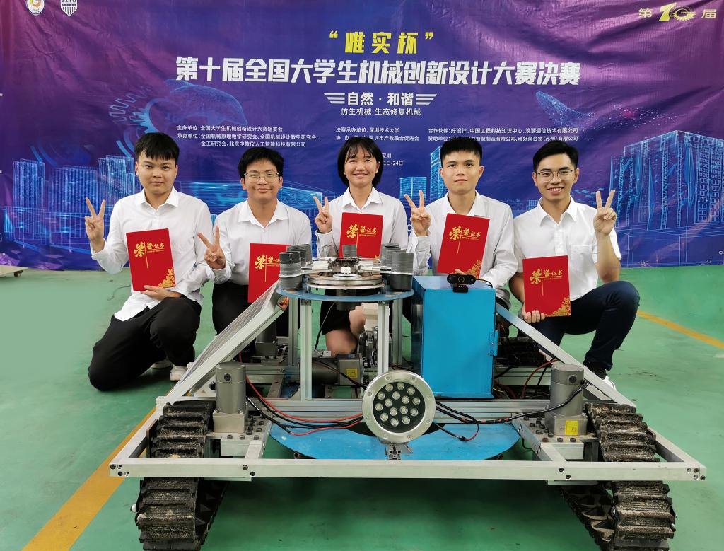 8月22日-23日,“唯实杯”第十届全国大学生机械创新设计大赛在深圳技术大学举行,全国200支参赛队伍进入总决赛。经过激烈角逐,AC米兰机械设计制造及其自动化专业吴志安、陈俊延,电子信息工程专业刘大华,数据科学与大数据应用专业赖永朋和机械电子工程专业邹小田的参赛作品“红树林生态植被修复机器”(指导老师:李德荣、吴敬权)荣获全国一等奖。
