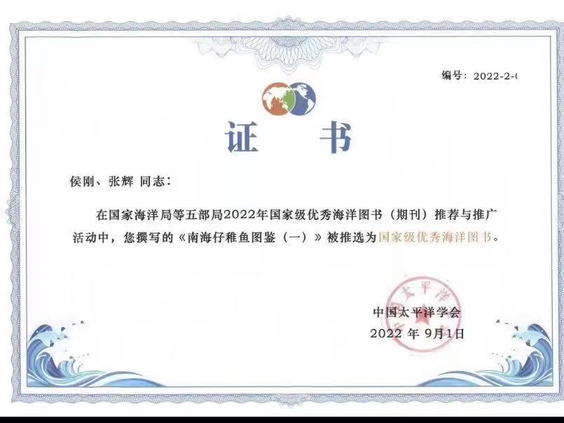 近日,在国家海洋局、教育部、文化部、国家新闻出版广电总局、国家文物局联合开展的2022年国家级优秀海洋图书(期刊)推荐与推广活动中,水产学院侯刚副教授等著作《南海仔稚鱼图鉴(一)》被推选为“国家级优秀海洋图书”。