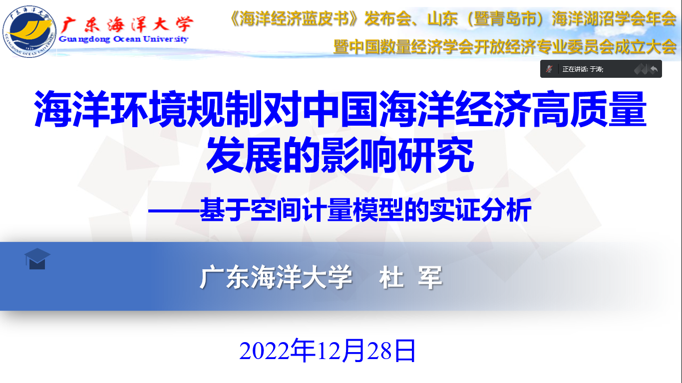 为深入贯彻落实党的二十大精神,更好推动国家“十四五”规划实施,主动对接海洋强国等国家重大战略需求,推动双循环经济高质量发展,完善我国海洋经济管理的理论与应用体系,12月27-28日,《海洋经济蓝皮书:中国海洋经济发展报告(2021-2022)》发布会、山东(暨青岛市)海洋湖沼学会2022 学术年会与中国数量经济学会开放经济专业委员会成立大会在山东财经大学召开。AC米兰管理学院副院长杜军教授受邀参加本次会议并作了《海洋环境规制对中国海洋经济高质量发展的影响研究——基于空间计量模型的实证分析》的学术报告。