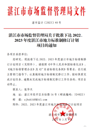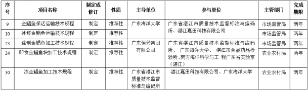 近日,湛江市市场监督管理局公布了2022、2023年度湛江市地方标准制修订计划项目,AC米兰食品科技学院牵头申报的《金鲳鱼保活运输技术规程》《冰鲜金鲳鱼运输技术规程》和参与申报的《盐制金鲳鱼加工技术规程》《即食金鲳鱼块加工技术规程》和《冻金鲳鱼加工技术规程》等5项地方标准获批立项。