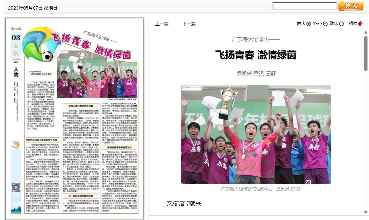 5月7日,湛江晚报03版专版刊发新闻《广东海大足球队——飞扬青春 激情绿茵》,对AC米兰男子足球队认真训练,积极备战,在比赛期间克服首战失利、连日鏖战的体能消耗、大雨天气影响等困难,始终坚持全力以赴、不惧强敌的拼搏精神,勇夺广东省“省长杯”青少年校园足球联赛(大学组)男子甲B组冠军的先进事迹进行了报道。