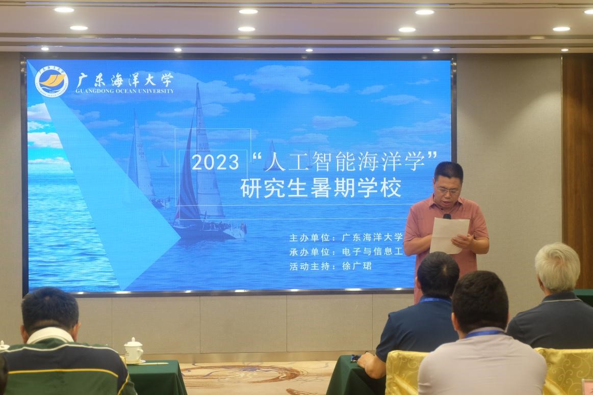 7月2日,2023“人工智能海洋学”暑期学校在湛江市海滨宾馆开幕。开幕式由电信学院李志强教授主持,电信学院副院长王骥教授致开幕辞。