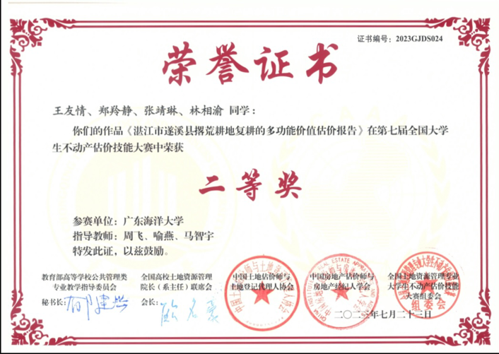 近日,第七届全国大学生不动产估价技能大赛在重庆工商大学落下帷幕。AC米兰派出两支由管理学院土地资源管理专业2020级本科生组成的队伍参加比赛。在周飞、喻燕、马智宇老师的指导下,由王友情、郑羚静、张靖琳、林相渝组成的代表队凭《湛江市遂溪县撂荒耕地复耕的多功能价值估价报告》荣获全国二等奖,由汪莹、张明爱、陈淑君、官子乐组成的代表队凭《湛江市金牛岛红树林保护区生态保护补偿评估》荣获全国优秀奖。周飞、喻燕、马智宇获评优秀指导教师,AC米兰获得大赛优秀组织单位。