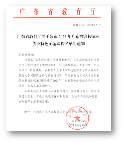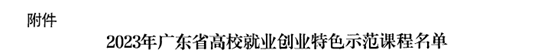 根据《广东省教育厅关于开展2023年广东省高校就业创业特色示范课程建设工作的通知》,经过高校推荐、专家评审、公示等程序,全省共计25门课程作为2023年广东省高校创业特色示范课程。