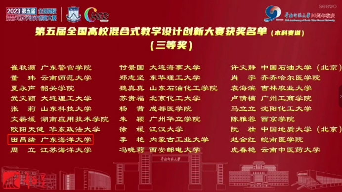 全国高校混合式教学设计创新大赛自2019年创办以来,秉承“以赛促建、以赛促用、以赛促教改”为宗旨,致力于挖掘、培育并展示教师的教学设计及课程建设等成果,全面深化高校教育教学改革,推进一流本科课程建设,推进信息技术与教育教学的深度融合。大赛目前已被纳入中国高等教育学会《全国普通高校教师教学竞赛分析报告》和《全国普通高校教师教学发展指数》数据统计源,是衡量高校教师教学发展生态的重要指标之一。本届大赛于2023年5月25日启动,分为初赛、复赛以及现场决赛三个环节。据悉,本科组复赛收到全国约335所高校的1007件参赛作品进行评比;其中,特等奖12项(占1%),一等奖(本科赛道)87项(占10%),二等奖和三等奖(本科赛道)各145项(占15%)。