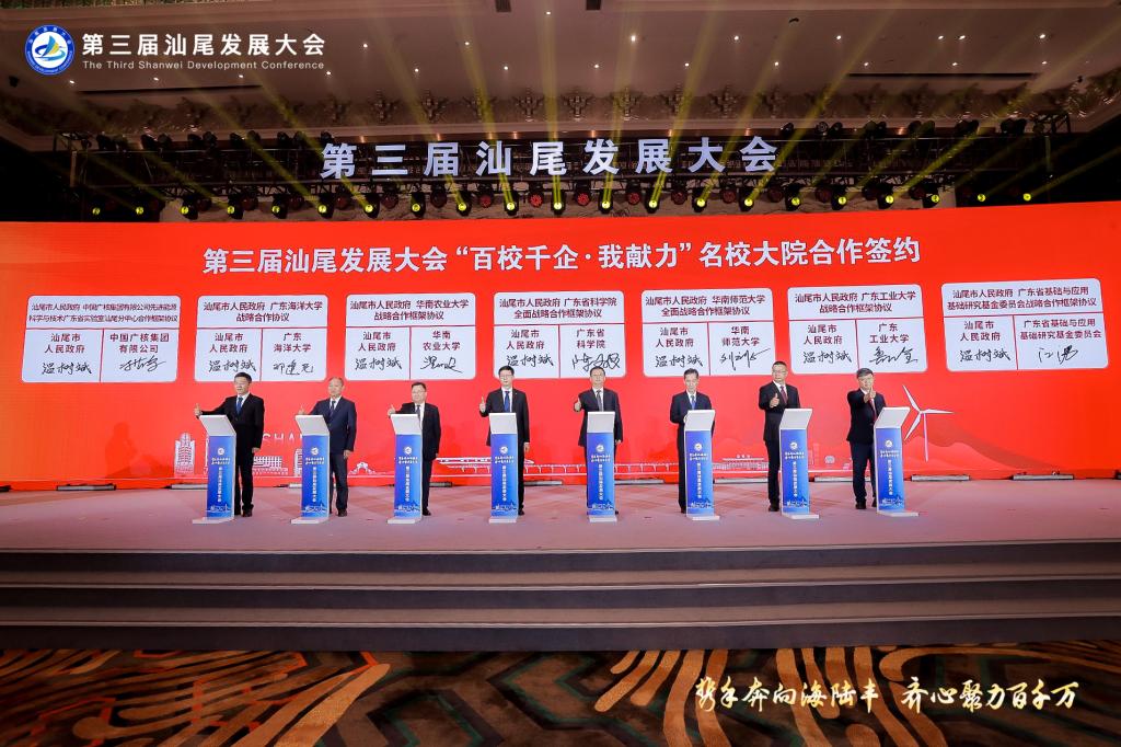 11月11日上午,学校副校长邓逢光带队参加了以“携手奔向海陆丰、齐心聚力百千万”为主题的第三届汕尾发展大会。在大会“百校千企·我献力”专题环节,邓逢光代表学校,和广东省科学院、华南师范大学、华南农业大学等7家单位一起与汕尾市政府签订名校大院科技赋能汕尾“百千万工程”、高质量发展战略合作协议。