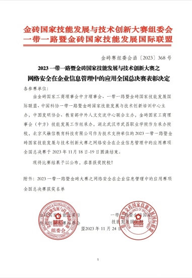 金砖国家技能发展与技术创新大赛是2017年金砖国家领导人会晤筹备委员会认可、经中华人民共和国外交部备案、金砖国家工商理事会批准的国际大赛。金砖大赛得到了金砖五国的高度认可和中华人民共和国工信部、教育部、人社部、国务院国资委下属相关单位的支持。“一带一路”暨金砖国家技能发展与技术创新大赛纳入《2023全国普通高校大学生竞赛分析报告》竞赛目录。