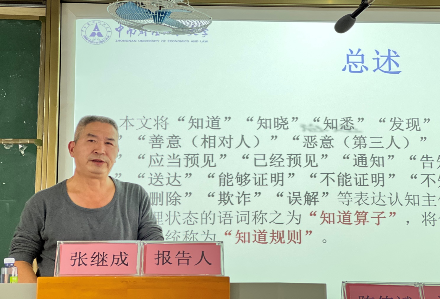 讲座开始,张继成教授首先向大家介绍了“知道算子”与“知道规则”的概念,表示对事实和法律的“知道”是法律推理和法律适用的认识论基础和逻辑起点。张继成教授指出,我国立法表述与学理解释对“知道算子”核心概念的理解有所出入,这导致了“同案不同判”的司法乱象,由此引入本次讲座的主题。随后,张继成教授对“知道”、“应当知道”、“应当不知道”、“明知”这几个关键的知道算子展开了法逻辑诠释。在此基础上,张继成教授全面地、深入浅出地分析了知道命题、知道规则的构成要素和逻辑结构。最后,张继成教授总结了揭示知道算子完整含义的理论意义与实践意义,即形成对知道算子的解释方法和证明方法的系统科学认识、提高知道规则立法表述的科学性、可以提炼出关于知道算子的立法表述和司法解释的基本规则,并鼓励大家积极学习研究知道规则的相关理论。