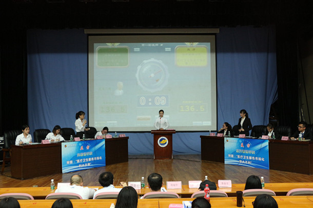 随着辩论赛主席一声令下,辩论赛决赛正式开赛。正方外国语学院和反方经济管理学院围绕医疗卫生服务市场化是利大于弊还是弊大于利展开了辩论,双方辩手在开篇立论、攻辩、自由辩论和总结陈词四个环节中,通过引用大量的数据和事实,试图驳倒对方的同时征服现场的评委和观众。双方唇枪舌战,精彩纷呈,现场不时响起阵阵掌声。