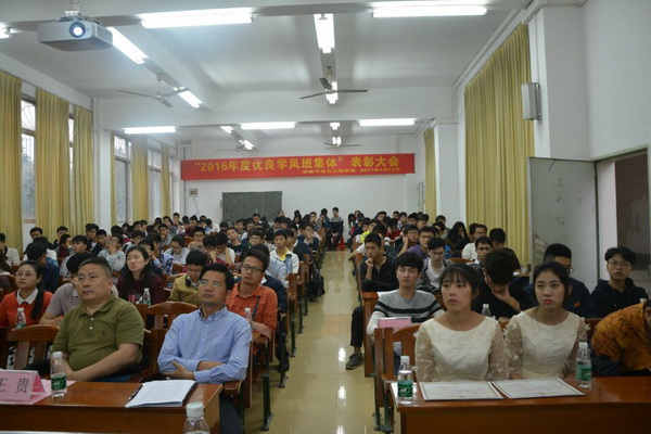 俞国燕首先宣读了学院表彰决定。根据《机械与动力工程学院优良学风班集体评选办法》,建能1131、能源1143、机制1148、工业1151、机制1155、机制1157、能源1151、能源1155、建能1152、工设1151十个班级获得机械与动力工程学院 “2016年优良学风班集体”称号,学院领导为他们颁奖,优良学风班集体获奖代表机制1157班何梓阳同学做了交流发言,介绍了本班所取得的成绩及加强学风建设的做法,建能1152班学生代表宣读了“机械与动力工程学院关于进一步加强学风建设倡议书”,向学院全体同学倡议要坚定理想、立志成才;尊重老师、懂得感恩;明确目标、端正态度;严于律己、自强不息;敢于创新、勤于实践;带头帮扶、争创优秀。随后,欧卫军简要介绍了学院学风存在的主要问题,并指出优良学风的形成是一项长期、艰苦的工作,是一项系统工程,需要持之以恒,常抓不懈。
