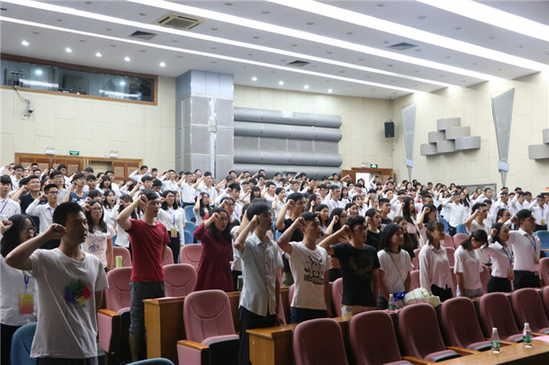 大会的最后,重温入团仪式,全体人员起立,团旗由国旗护卫队护送着,他们迈着整齐的步伐,昂首阔步走进舞台。全场伫立于鲜艳的团旗下,随后庄严的宣誓声响彻全场,换届大会圆满结束。