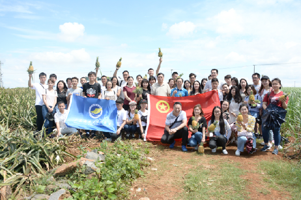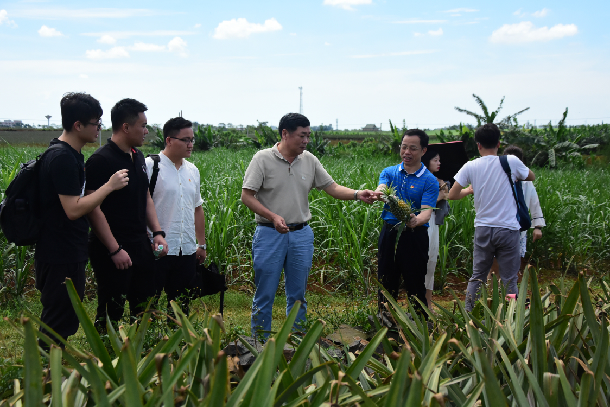 在湛江农垦局副局长宫玉林的带领下,师生一行首先来到位于雷州半岛南部闻名全国的成片菠萝种植基地——“菠萝的海”。这里漫山遍野都长满了菠萝,在太阳光的照耀下,一只只金灿灿的菠萝从茂密的叶丛中探出头来。来到田边,宫玉林亲自为研究生同学们讲解菠萝品种的培育知识、市场营销和加工等方面的情况。经历了一代代农垦人艰苦开荒创业,目前湛江农垦集团在雷州半岛种植菠萝面积超过40万亩,是全国最大、设备最先进的菠萝生产、加工和科研基地。随后,宫玉林热情地带领大家走进田间采摘菠萝,体验丰收的喜悦。紧接着,一行参观了菠萝罐头生产车间,了解菠萝罐头生产、加工、制作的完整生产流水线。最后,一行还现场观摩了无人机喷洒作业,详细了解了农垦集团农业现代化、规模化生产情况。