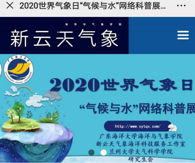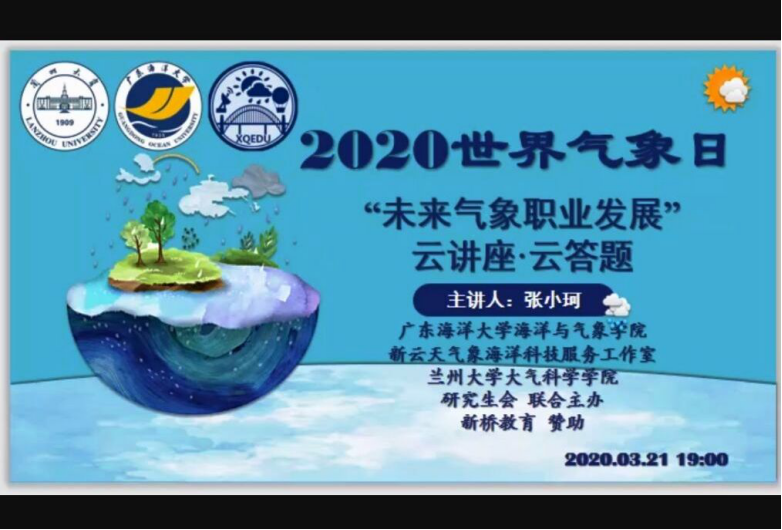 3月23日,是第60个世界气象日。为纪念世界气象组织成立,广泛宣传气象工作,提升对气象研究兴趣,3月20至21日,海洋与气象学院新云天气象海洋科技服务工作室与兰州大学大气科学学院研究生会通过互联网联合举办了三场主题“云活动”。来自AC米兰及兰州大学、南京信息工程大学、中山大学等高校的老师和学生近1200人次参加了各项活动。活动得到学校党委宣传部海浪传媒、兰州大学安特莫斯俱乐部等部门和网易网站、新桥教育等单位的大力支持。