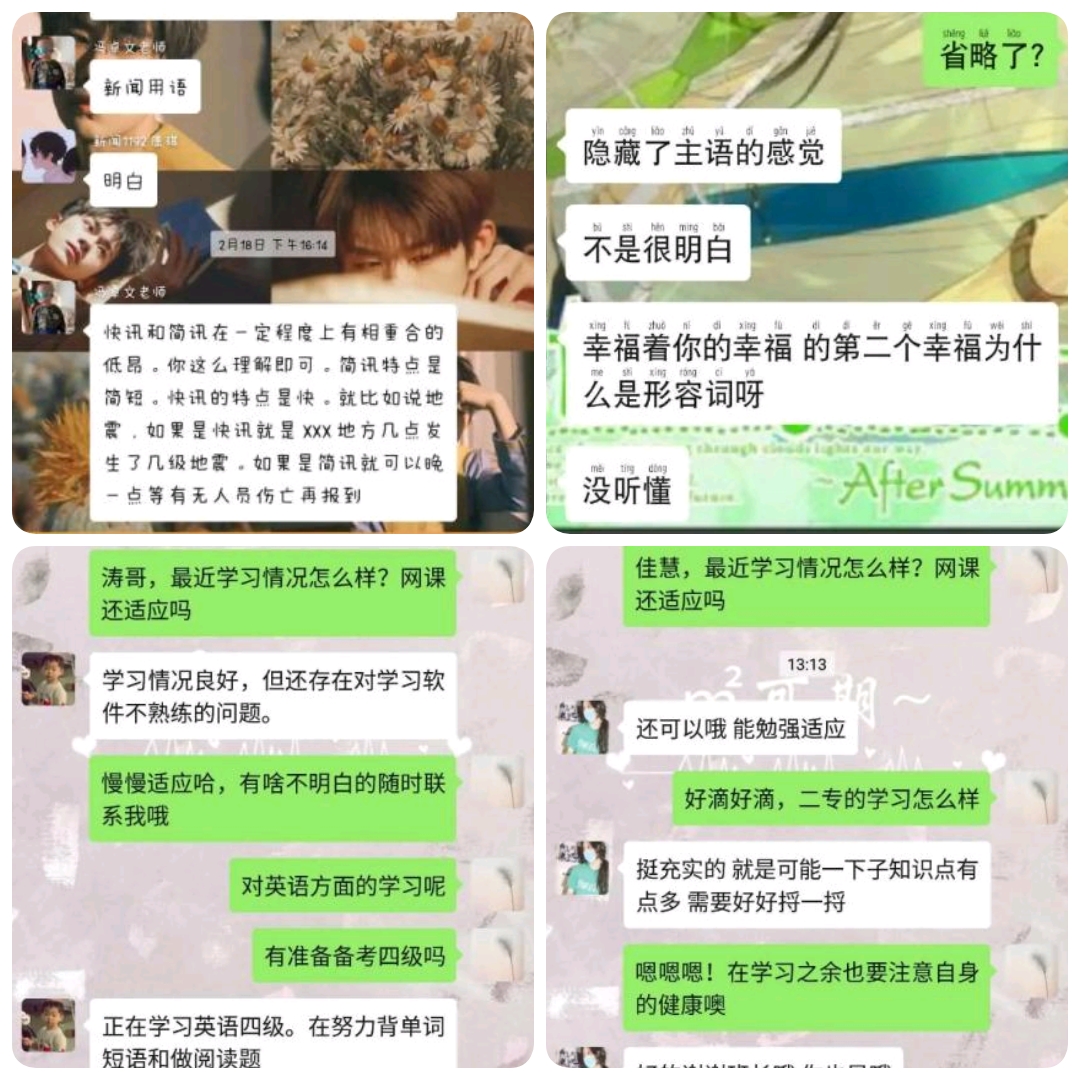 “学业提升”主要是进行补考课程备考辅导。文传学院为每门学科分配数位朋辈导师,朋辈导师建有微信群或QQ群,对学业有困难的同学开展有针对性的线上辅导,帮助有补(缓)考科目的同学充分利用居家时间认真学习,完成好学习新科目和复习补(缓)考科目的双重任务。